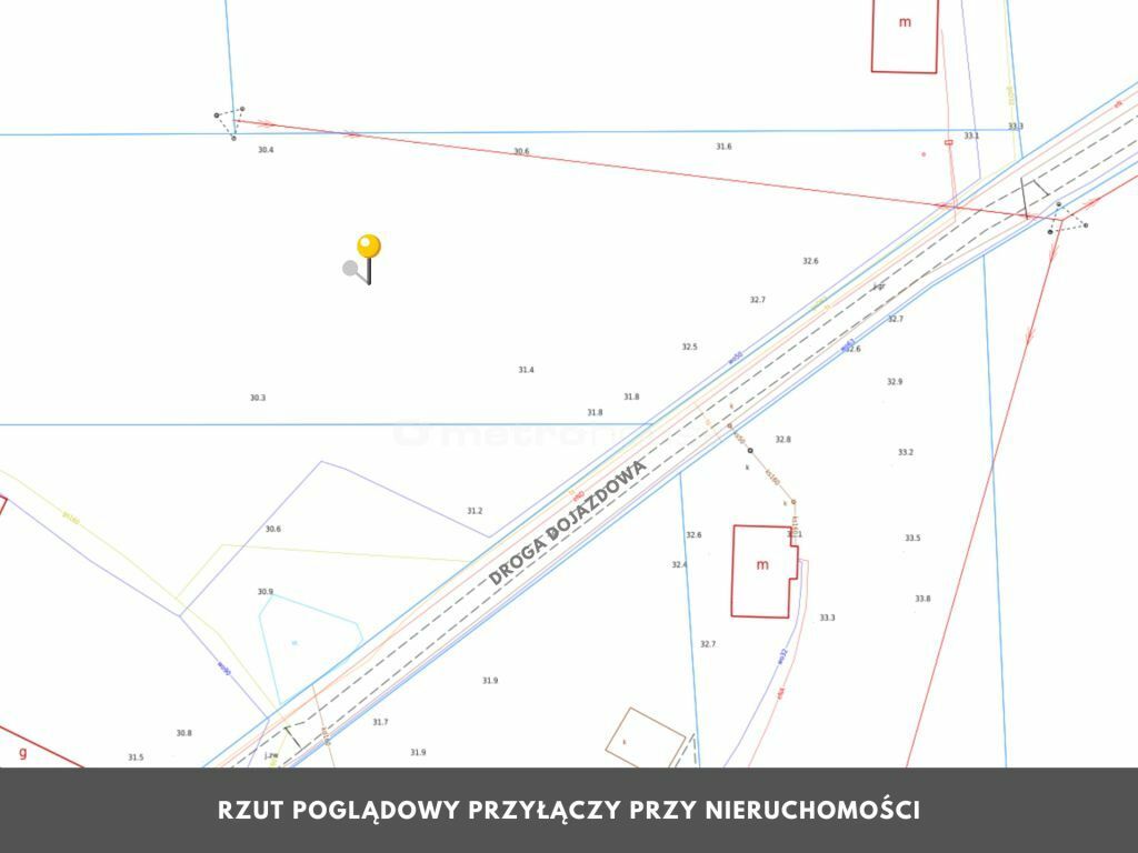 Prowadzi do niej utwardzona, częściowo z płyt betonowych, częściowo żwirowa droga gminna. Działka nie jest uzbrojona natomiast wszystkie media są w drodze. Dla działki tej wydano decyzję na budowę dla budynku mieszkalnego jednorodzinnego w zabudowie zagrodowej.